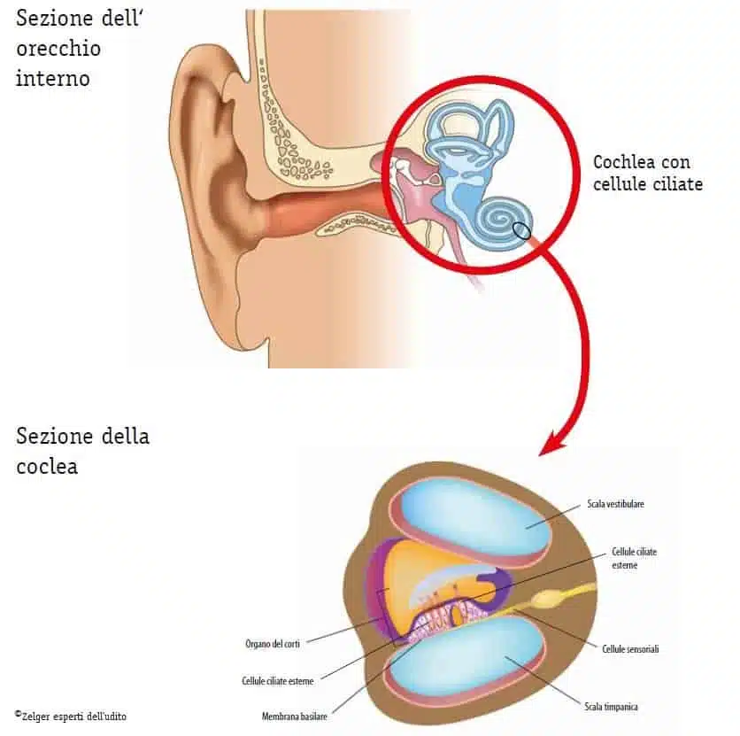 A questo punto, nella coclea piena di liquido, avviene il sentire vero e proprio. Il suono, trasformato in onde di pressione, muove la membrana all’interno dell’organo del Corti come il vento increspa il mare. Questo fa piegare la ciglia dei recettori acustici, provocando uno stimolo. A seconda del volume e della frequenza del suono questo stimolo può essere molto diverso. Queste oscillazioni vengono trasmesse in forma di impulsi elettrici attraverso le 30.000 fibre nervose al cervello, dove vengono poi elaborate nelle rispettive aree. In una frazione di secondo siamo in grado di riconoscere se abbiamo sentito una voce famigliare o dei suoni distorti.